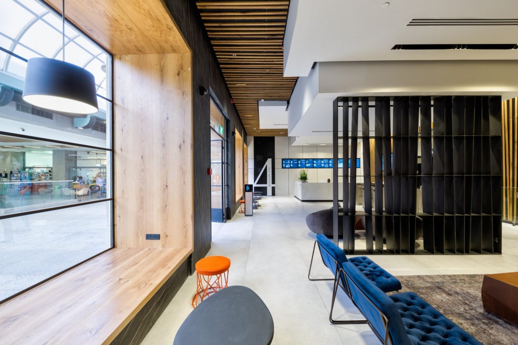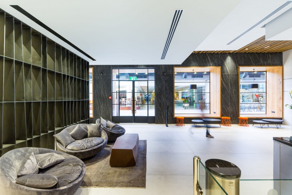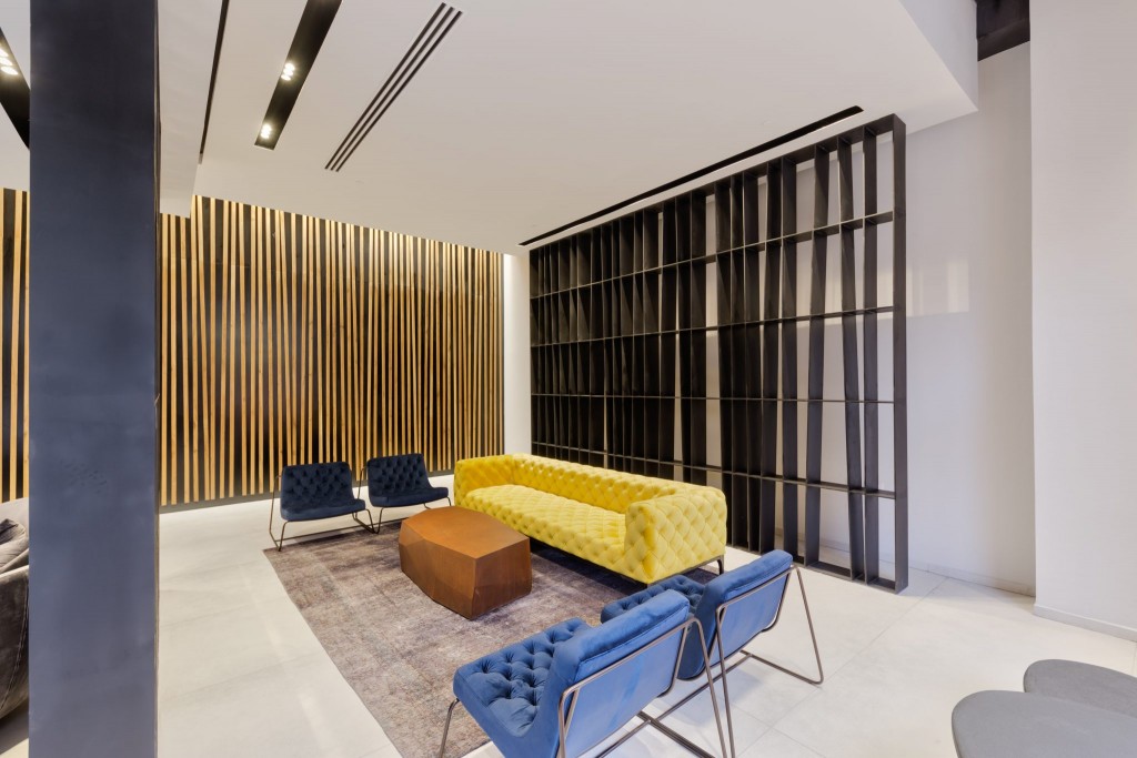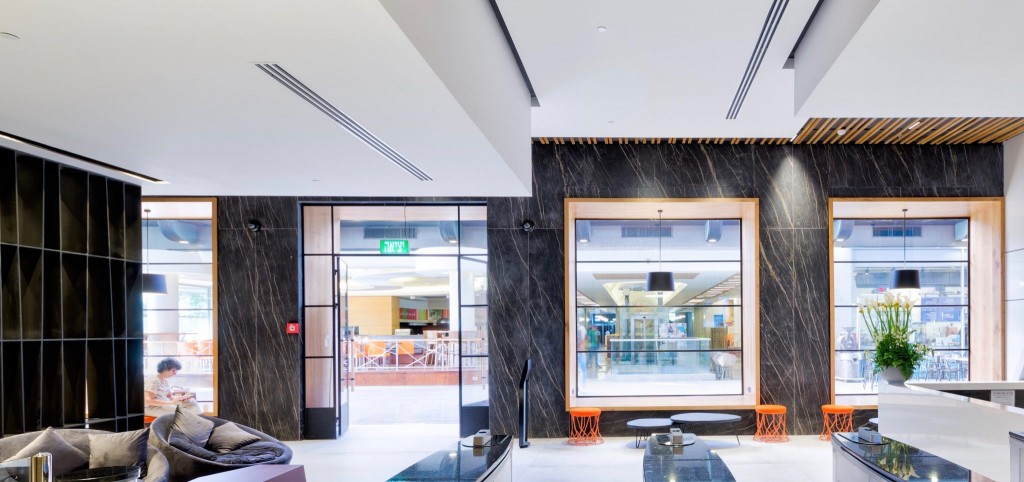 פרוייקט בלובי בניין עתידים הכולל ויטרינות מפרופיל בלגי ברזל, חלונות ודלתות מפרופיל בלגי ברזל, מחיצות ברזל מעוצבות בלובי.