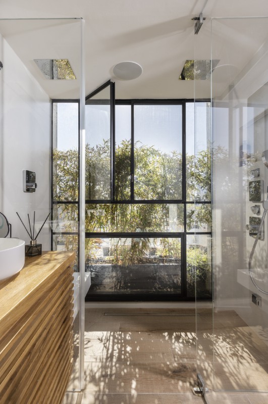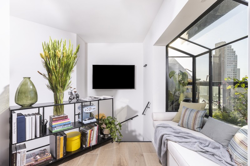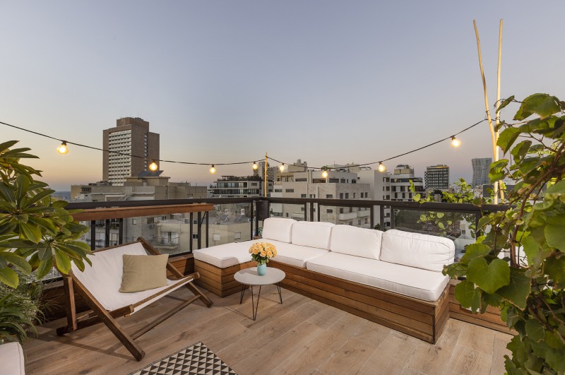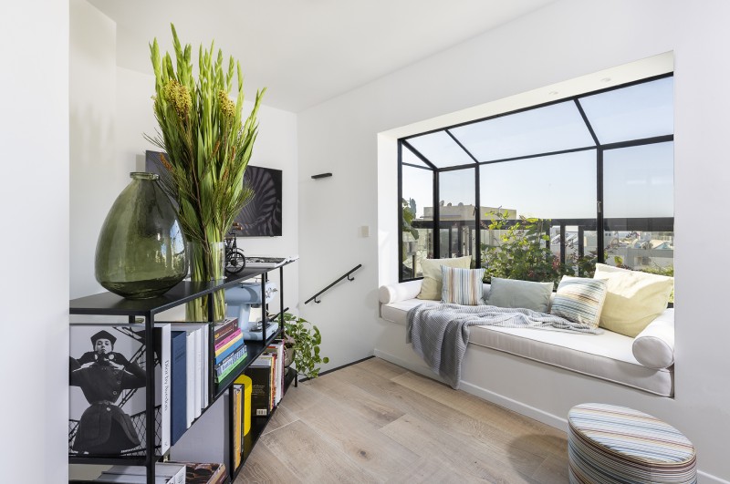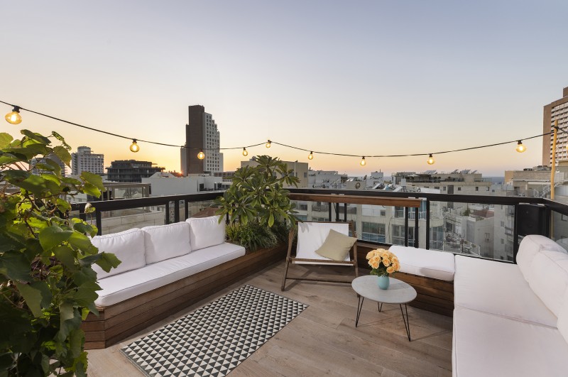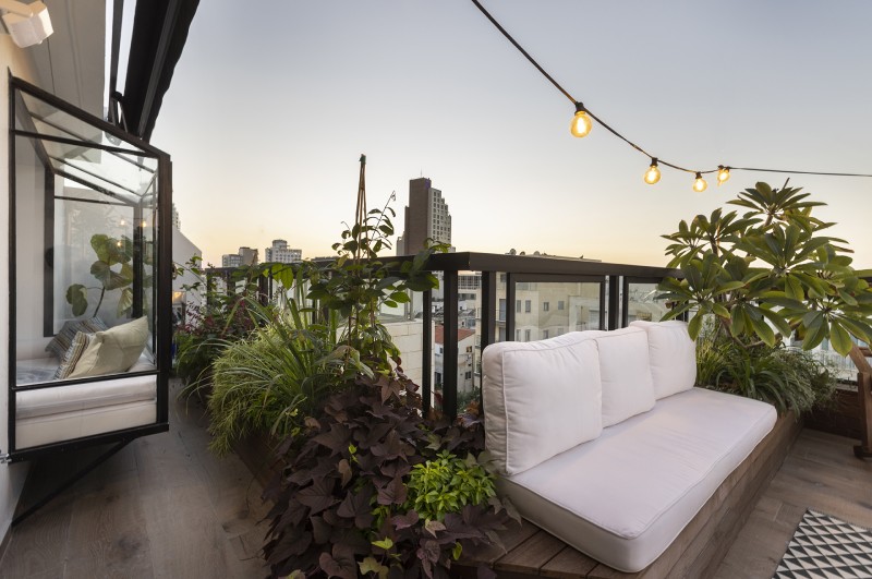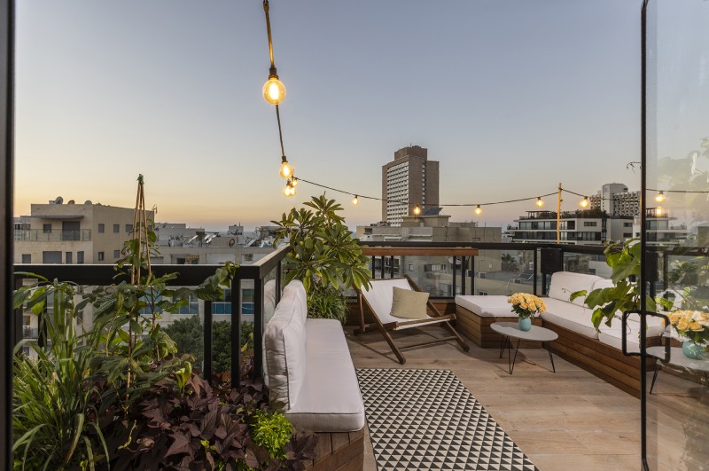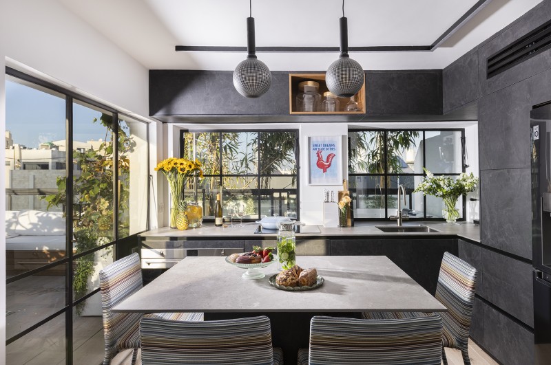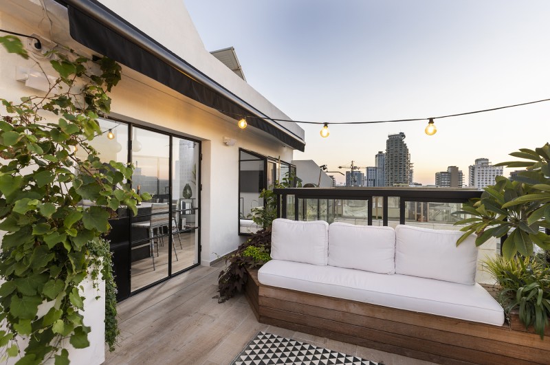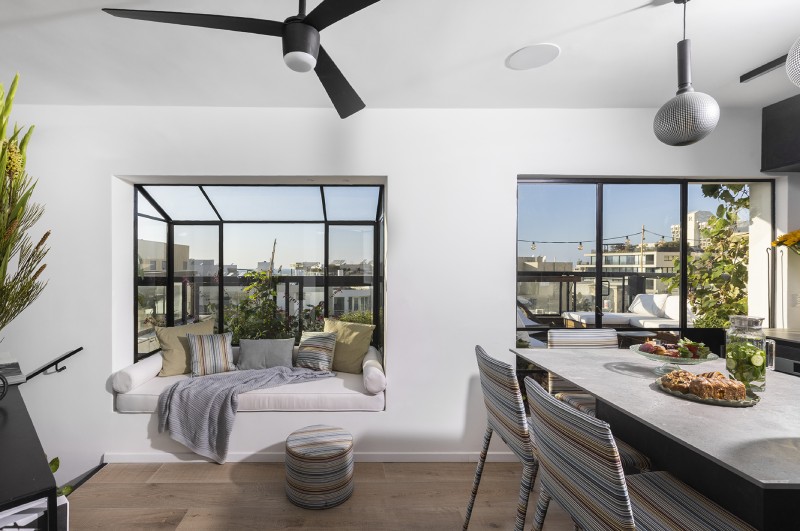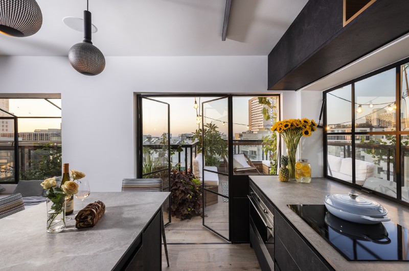 פרויקט דירת גג בבן יהודה תל אביב – תאורת ברזל, עיצוב מודרני, חלונות בלגיים בצבע שחור, חלונות שמש.