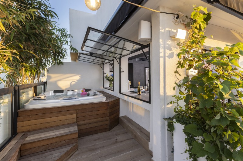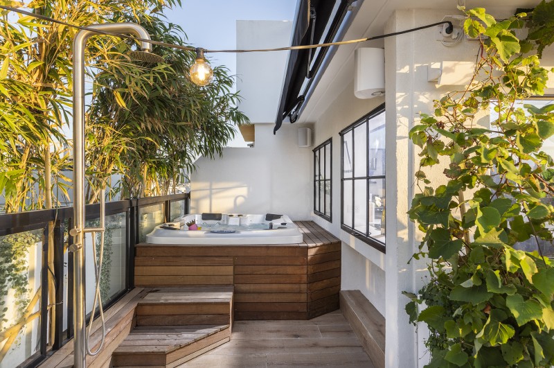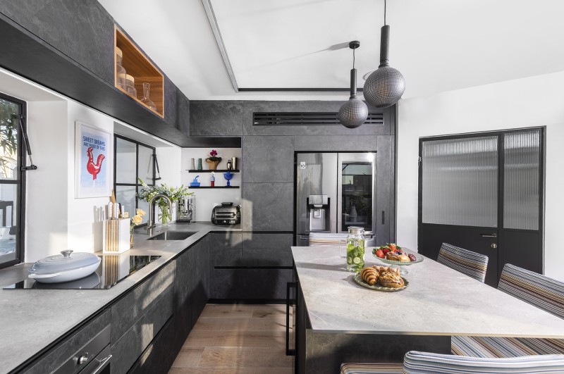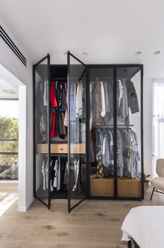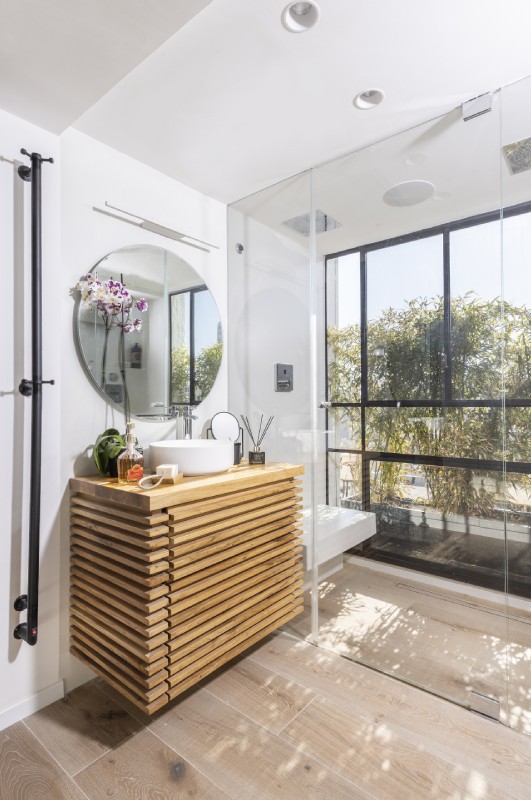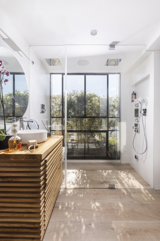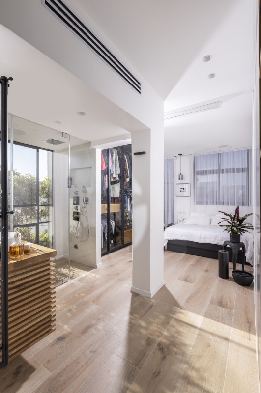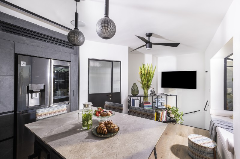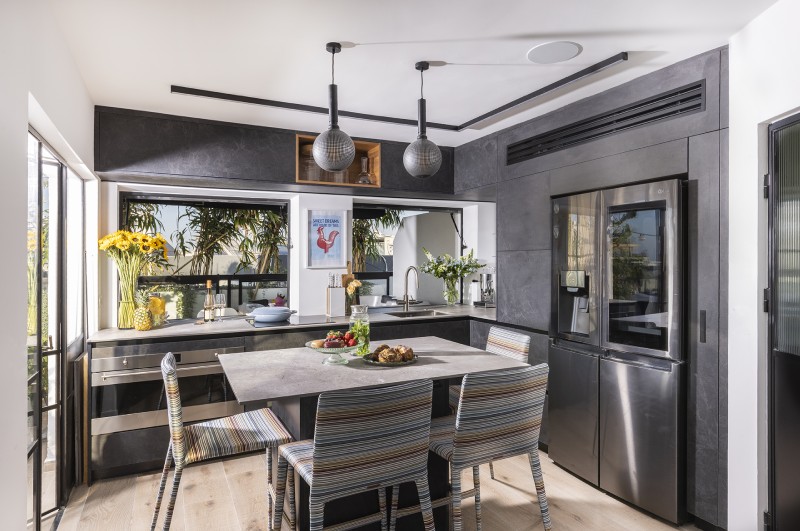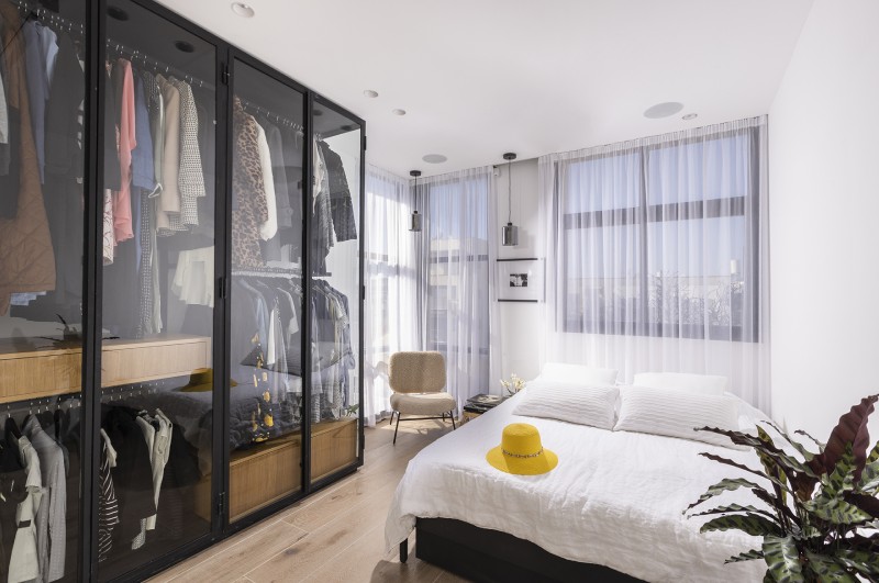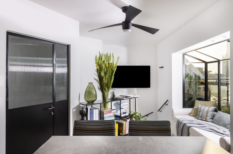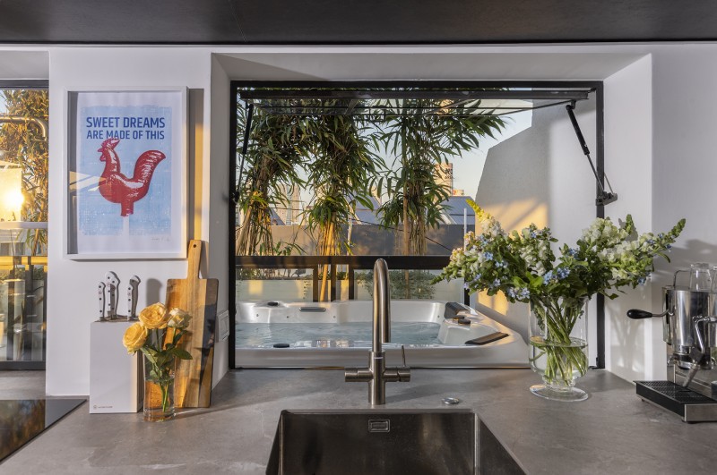 פרויקט דירת גג בבן יהודה תל אביב – תאורת ברזל, עיצוב מודרני, חלונות בלגיים בצבע שחור, חלונות שמש.