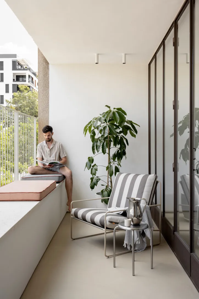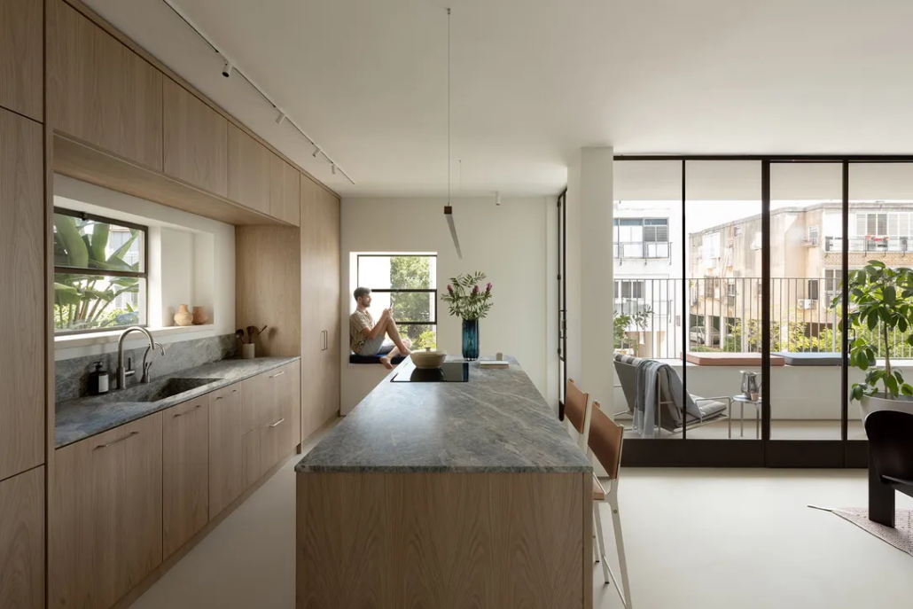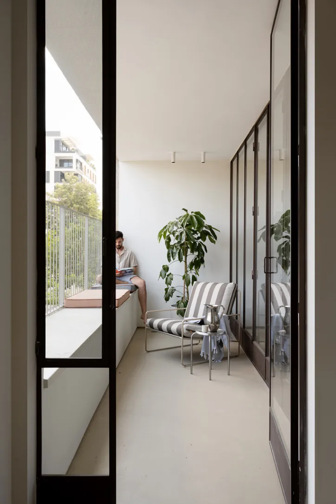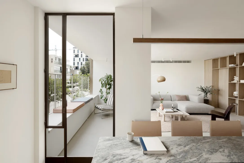 קיר הסלון בנוי מפרופיל בלגי, משקיף על הרחוב עם יציאה למפרסת המכניסה לדירה אור טבעי לאורך רוב שעות היממה.