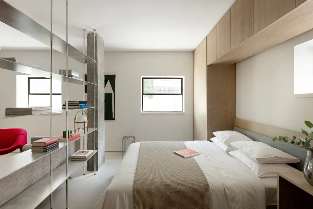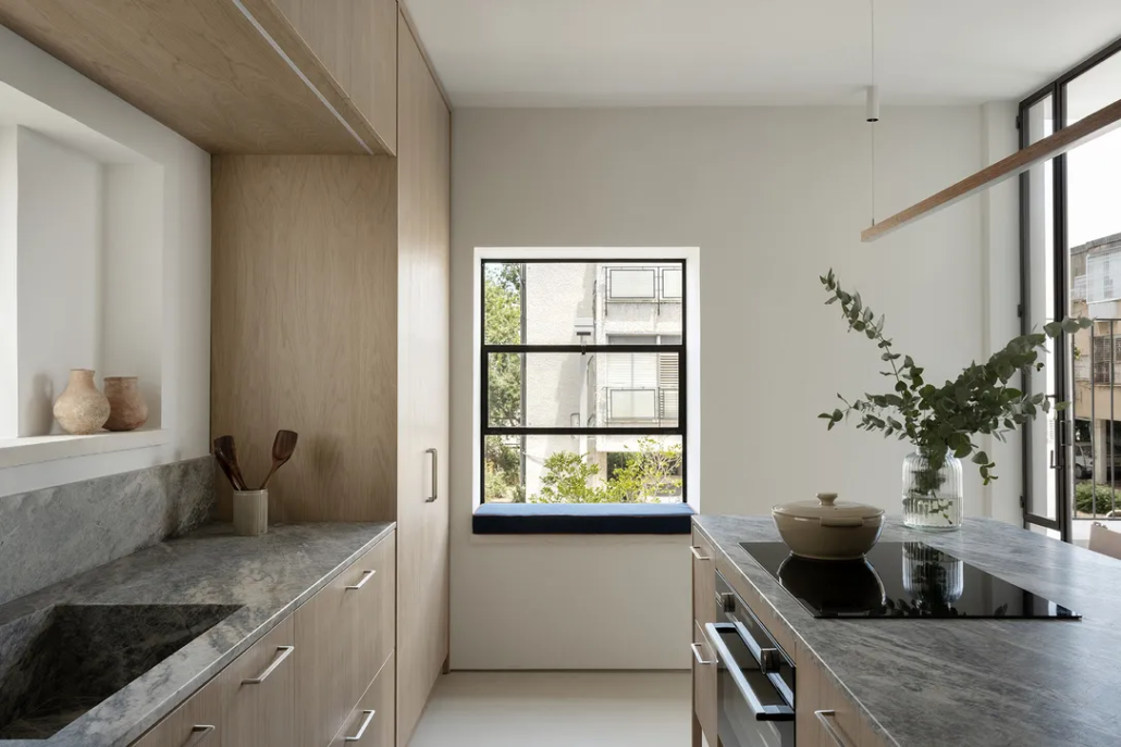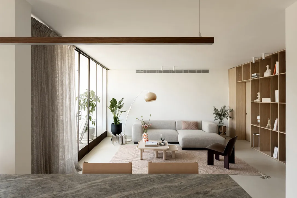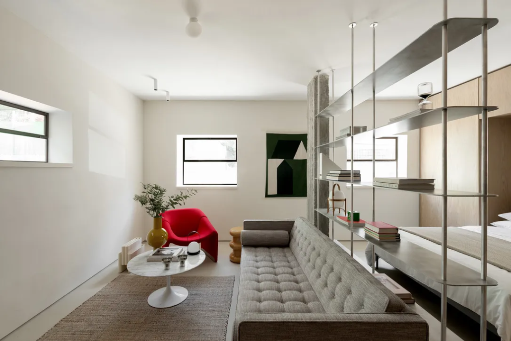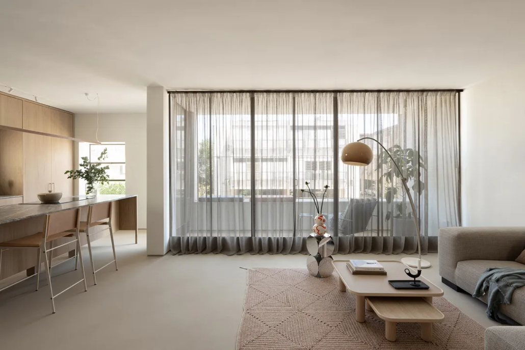 קיר הסלון בנוי מפרופיל בלגי, משקיף על הרחוב עם יציאה למפרסת המכניסה לדירה אור טבעי לאורך רוב שעות היממה.